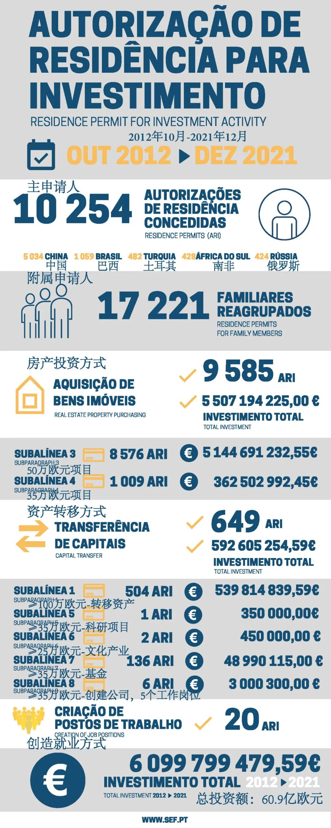 不久前,葡萄牙移民局(SEF)公布了自2012年10月黄金居留政策推行以来的整体数据,数据显示,截至2021年12月,葡萄牙黄金签证共签发10254位主申请人,总投资额接近61亿欧元。数据显示,中国申请人为5034人,占比接近50%,可见国人对葡萄牙项目的喜爱和认可。在35万欧基金投资方面,申请人数和获批数据较上一年均大幅增加.
