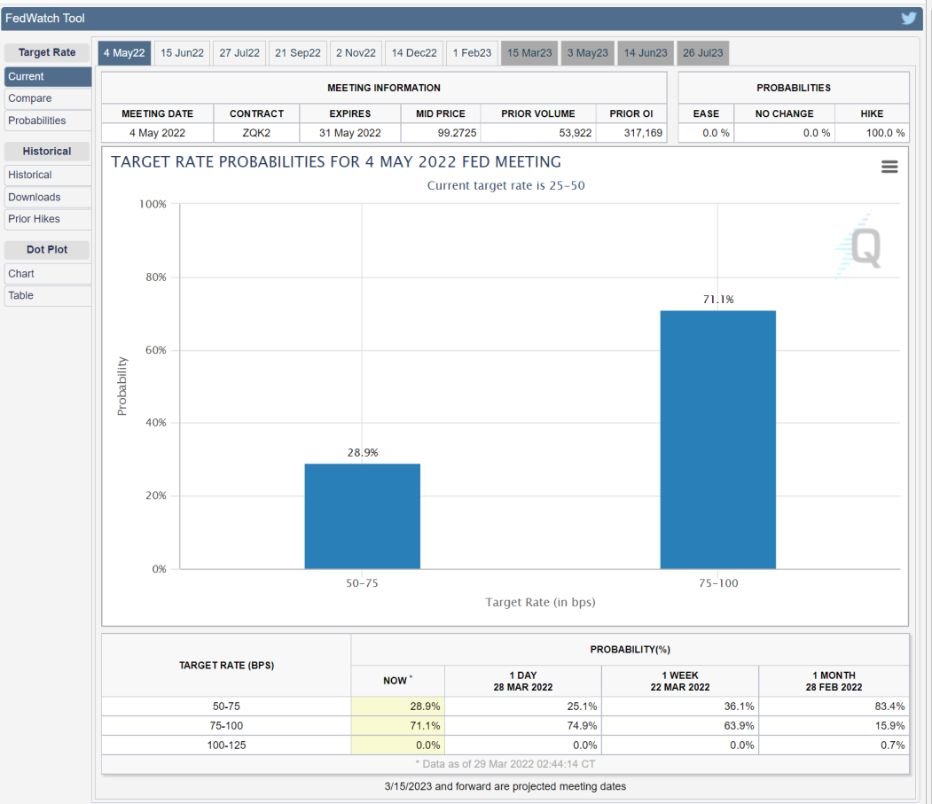 如果通胀“高烧不退,美联储准备在5月份加息50个基点。根据Fed Watchtool最新数据显示,市场预期美联储5月加息的概率已经达到71.1%。