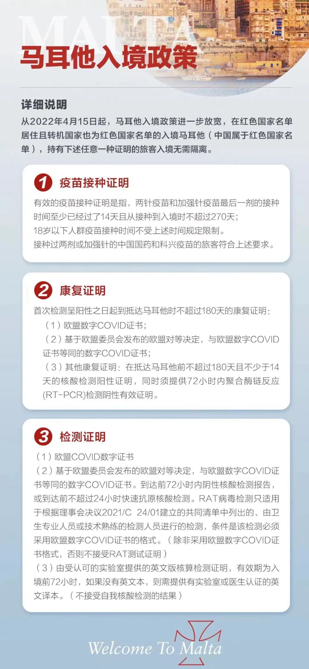 2022年4月15日起,在红色国家名单居住且转机国家也为红色国家名单(中国在红色名单中)的入境马耳他,持有疫苗接种记录、新冠康复证明和核酸检测报告三项中的任一种,入境都不需要隔离.