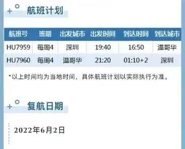 根据海南航空公布的最新通知显示,HU7959(深圳-温哥华)及HU7960(温哥华-深圳)航线已经官宣复航!!!