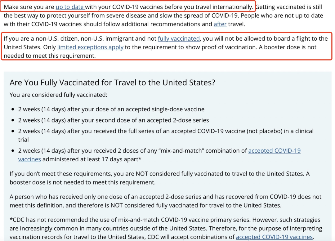 同时CDC也提醒到,国际旅客在出行前,请确保已接种 COVID-19 疫苗。如果您是非美国公民、非美国移民且未完全接种疫苗,您将不被允许登上飞往美国的航班;美国公民或绿卡持有者无此要求。