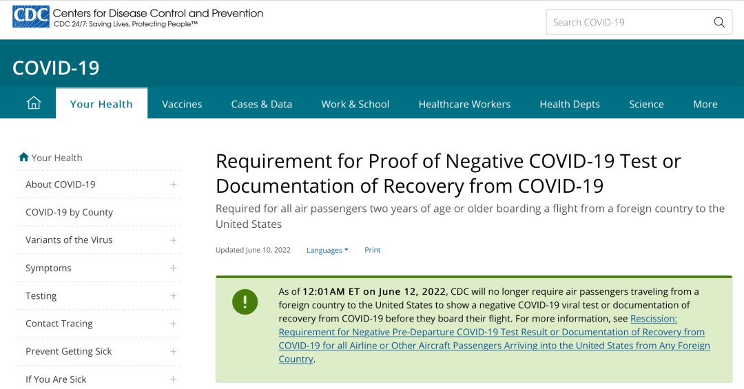 6月10日, 拜登政府宣布自美国东部时间 2022 年 6 月 12 日凌晨 12:01 起,美国疾病控制和预防中心(CDC )将不再要求国际旅客在登机前出示24小时内的COVID-19核酸阴性检测报告或康复报告要求。
