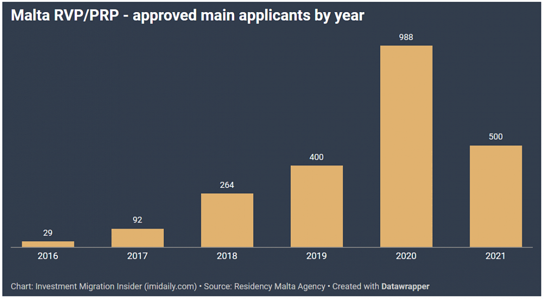 前不久,马耳他公布了自2016年以来通过MRVP(现MPRP)项目获得居留签证的申请者数据。截至2021年,共计2273位主申请人获批。
