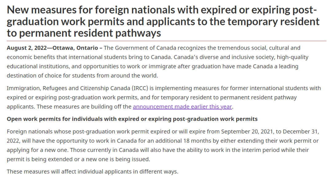 注:符合毕业工签再延18个月的政策的申请人不可以在边境申请,所有网上申请都需要在2022年12月31日前完成。