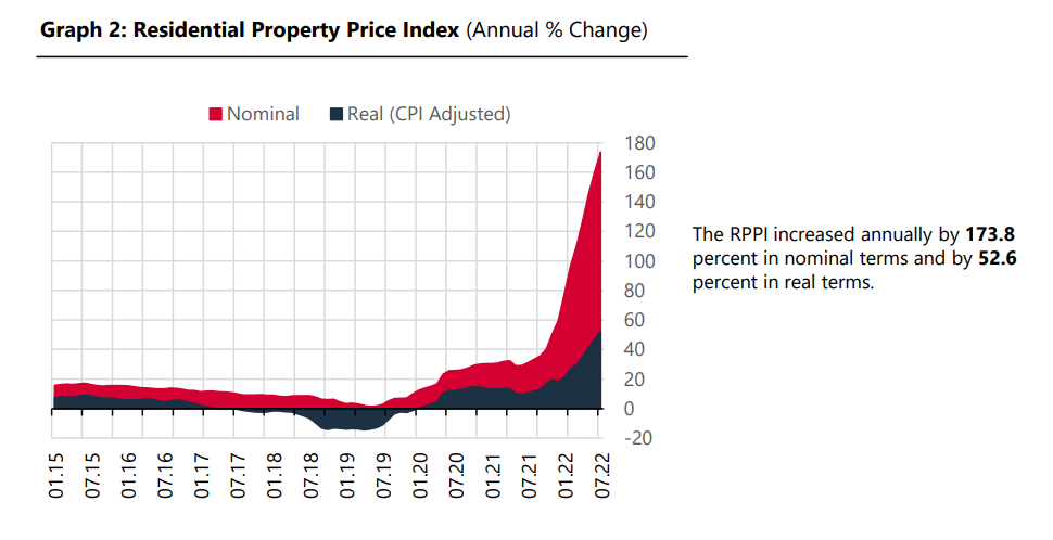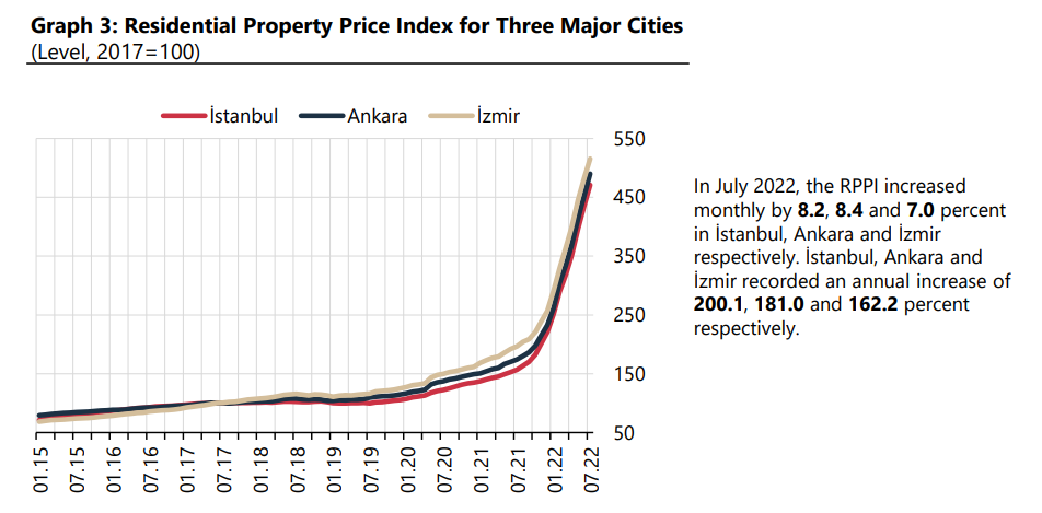 近日,土耳其央行发布了2022年7月土耳其房价指数,7月土耳其房价月增长8%,年涨幅173.8%。