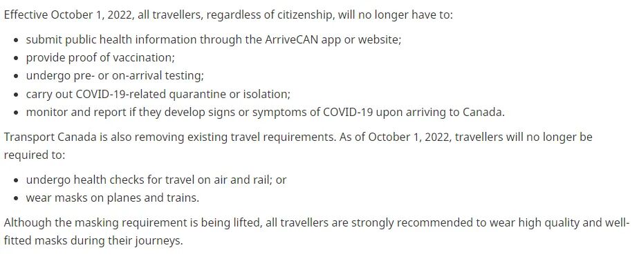 加拿大公共卫生署 (PHAC) 表示,自2022年10月1日起,所有旅行者,无论其国籍如何,都将不再需要:通过 ArriveCAN 应用程序或网站提交公共卫生信息;监测并报告他们在抵达加拿大后是否出现 COVID-19 的迹象或症状。此外,加拿大境内的航班或火车上将不再强制佩戴口罩,不再需要接受航空和铁路旅行的健康检查。PHAC表示,取消旅行限制是由于加拿大的高疫苗接种率、较低的住院率和死亡率,以及疫苗增强剂的可用性和使用。不过政府仍然强烈建议旅客继续戴口罩并密切监测自己的健康状况。卫生部长让-伊夫·杜克洛斯(Jean-Yves Duclos)说:“很大程度上要感谢卷起袖子接种疫苗的加拿大人,我们已经到了可以安全解除边境卫生措施的地步。” “但是,我们预计COVID-19和其他呼吸道病毒将在寒冷的月份继续传播,因此我鼓励每个人都及时了解他们的COVID-19疫苗接种情况,包括加强剂量和采取个人公共卫生措施。不再强制ArriveCan应用程序申报,旅行者将不再需要将他们的旅行计划和疫苗接种证明上传到应用程序上。预计该公告是为了响应全球对COVID-19大流行的展望。随着越来越多的人接种疫苗并且该病毒像普通感冒一样成为地方病,而不是大流行病,病例数一直在下降。自去年 6 月起,加拿大已经暂停了对国内和出境旅行的疫苗接种要求。当时政府官员表示,暂停出示这些疫苗接种凭证反映了公共卫生状况的改善,90%的加拿大人已经接种了COVID-19疫苗。2020年,由于疫情影响,加拿大只迎来了184,590名新永久居民。而今年,与2020年同期相比,增加了158,050名新永久居民,即135.2%。据报道,加拿大移民部长Sean Fraser也在积极促进移民,正在研究两条新的途径。其中一条,对国际学生特别有利,使他们更容易获得加拿大的永久居留权。经IRCC工作人员证实,另一条路径也正在完善中。通过这个途径,无合法身份移民移民(undocumented migrants)也可以获得永久居留权。目前,劳动力短缺成为加拿大急需解决的问题,各省都需要大量的移民补充,移民利好也是层出不断,移民申请人的机会将更多。免责声明:本公众号部分内容整理自网络及公众号,版权归原作者所有。若未能找到文章出处,望谅解,如果有侵权行为,请与本账号联系,我们会在第一时间申明原文作者或者将侵权文章删除。并对转载、分享的内容、陈述、观点判断保持中立,不对所包含内容的准确性、可靠性或完善性提供任何明示或暗示的保证。