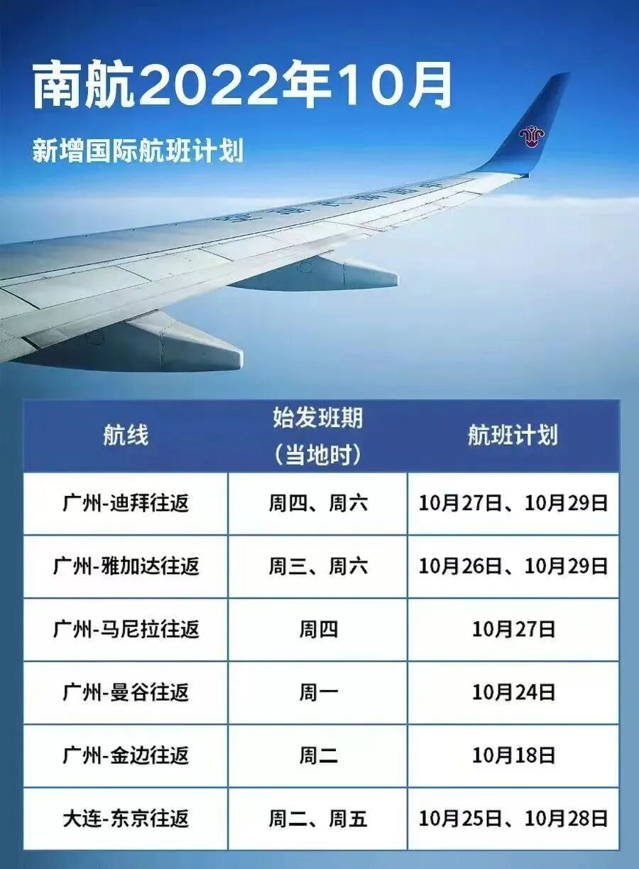 计划10月起恢复广州至雅加达、大连至东京成田航线,同时在广州-迪拜、广州-马尼拉、广州-曼谷、广州-金边等航线上增班。