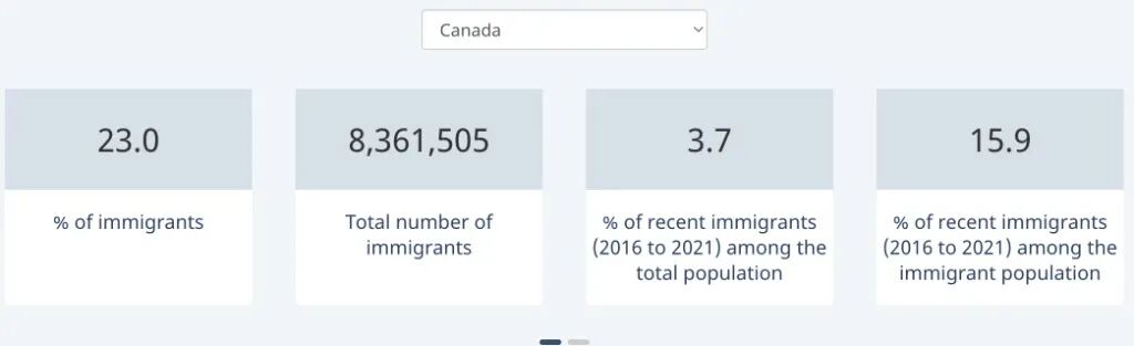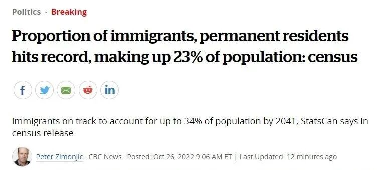 CBC新闻报道,根据2021年的人口普查数据,有830万人或23%的人口属于移民这一类别,超过了1921年22.3%的历史记录。