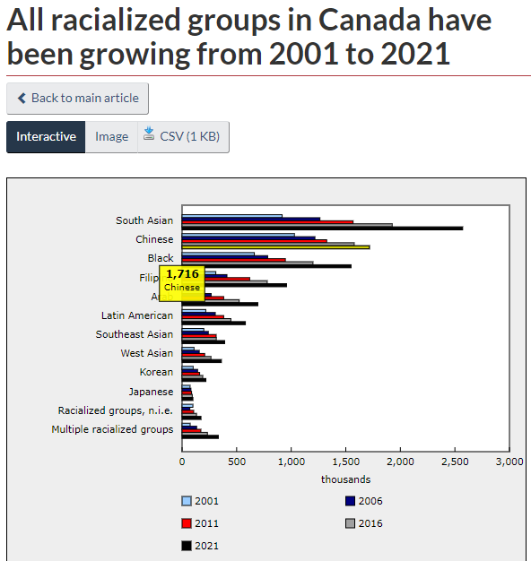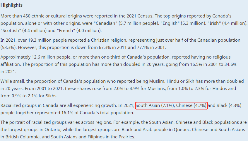 2021年,南亚人(7.1%)、华人(4.7%)和黑人(4.3%)共占加拿大总人口的16.1%。