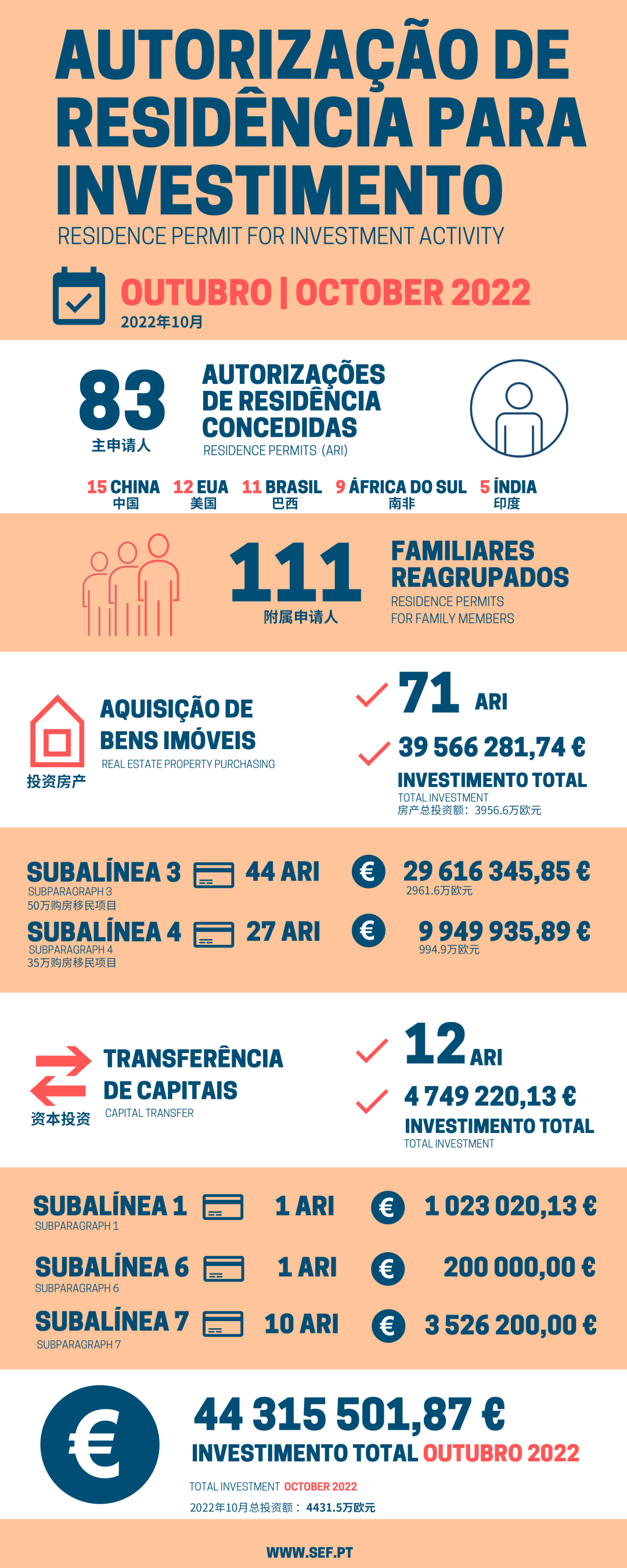 葡萄牙移民局(SEF)公布了2022年10月的黄金居留签证申请数据:2022年10月,共计有83位主申请人和111位附属申请获批葡萄牙黄金签证,获批总人数为194人,总投资额约4431.5万欧元。