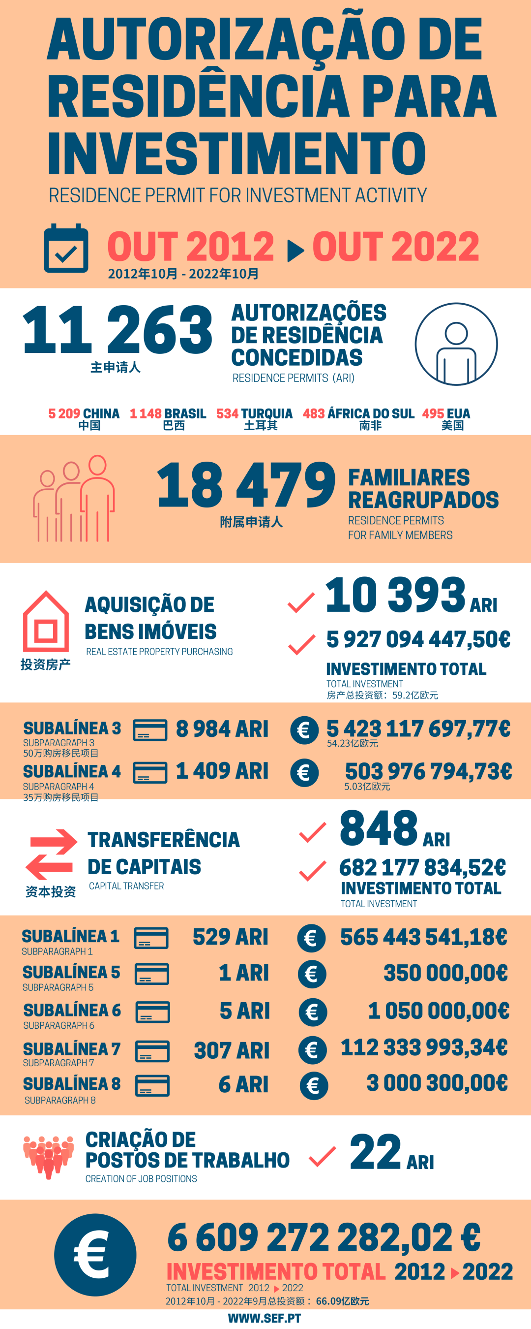 葡萄牙移民局也再次更新了2012年10月黄金居留政策推行以来的整体数据。数据显示:自2012年10月葡萄牙黄金居留计划推出至2022年10月底,已有11,263位主申请人获批葡萄牙黄金签证,获批附属申请人18,479位。其中,有5,209个中国家庭获批,占比约46%,中国申请人仍然遥遥领先!
