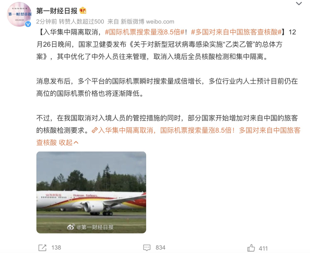 取消“五个一”及客座率限制等国际客运航班数量管控措施。各航司继续做好机上防疫,乘客乘机时须佩戴口罩。