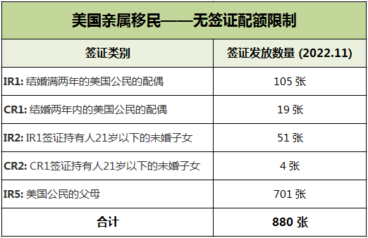 Immediate Relative Immigrant Visas:包括美国公民的配偶、美国公民的未成年子女(21岁以下)、美国公民的父母,这些划归为最亲亲属,无需排期,随到随办。