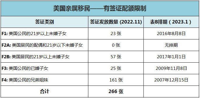 Family Preference Immigrant Visas,亲属类移民签证,按照优先级划分为4个等级,分别有着不同的排期。2023年1月表B开放,符合条件的美国亲属移民申请人可以向移民局递交I-485调整身份。