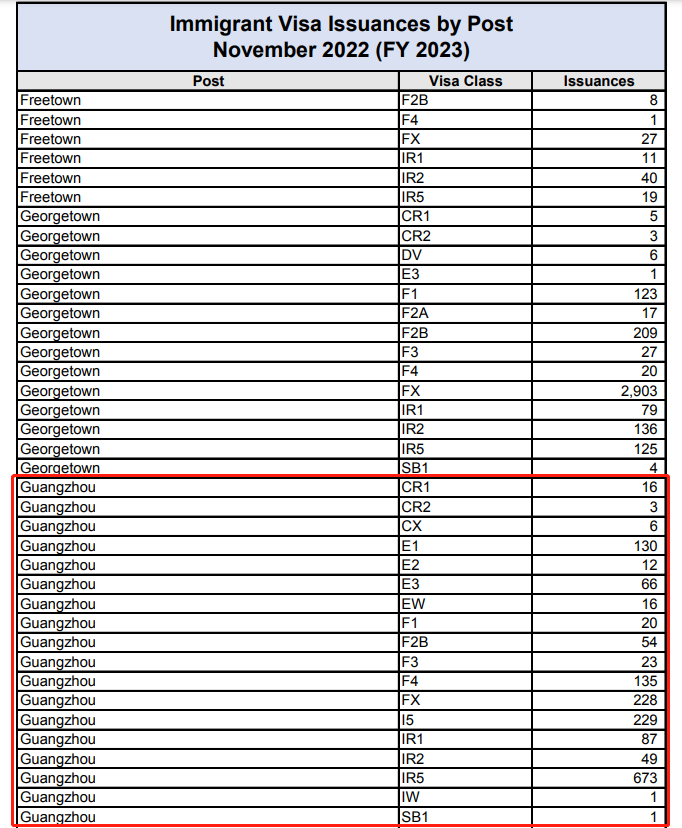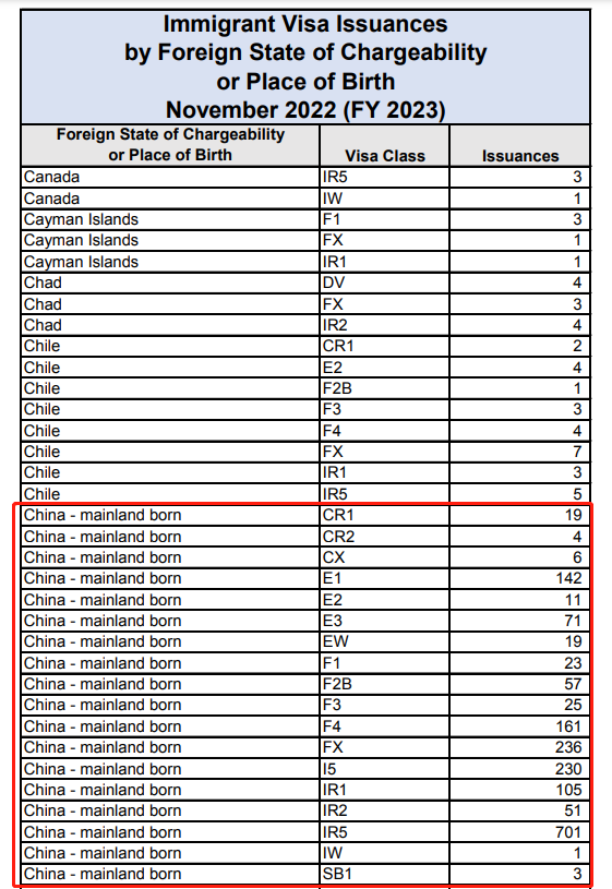 美国国务院每月会发布之前月份的移民签证发放情况。现在最新发布的是2022年11月份的统计数据。