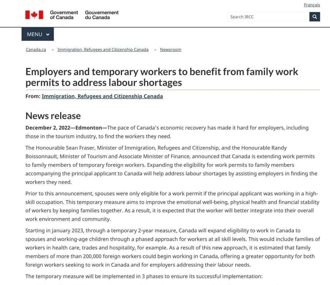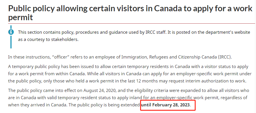 早在疫情初期,由于国际航班减少,各国入境政策也在时刻变化,有不少的短期签证持有者滞留在加拿大。因此移民局于2020年8月24日出台了允许游客在加拿大境内申请LMIA工作签证的临时政策,当时公布的政策将于2021年3月31日截止。随后,移民局将该政策延期到2023年2月28日。