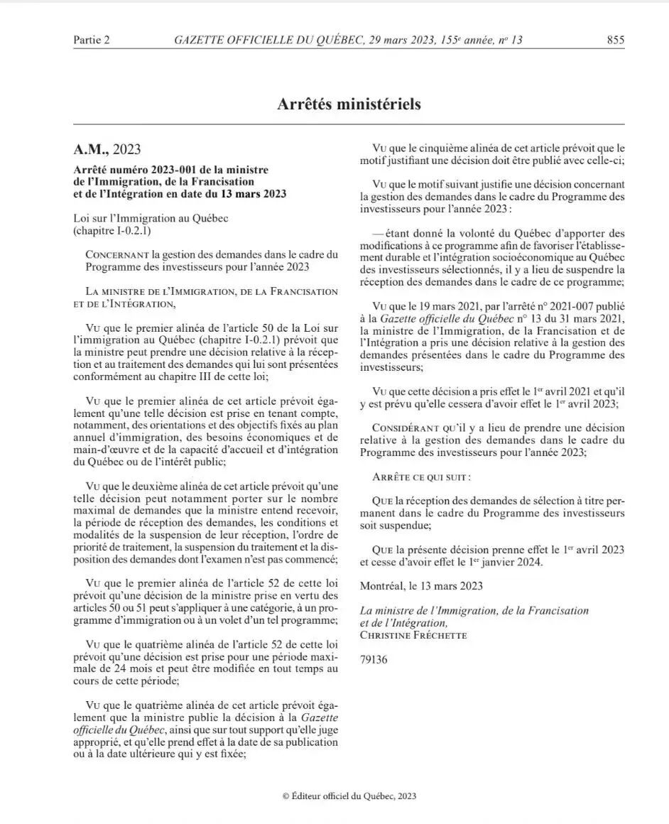 加拿大当地时间2023年3月29日,魁北克移民部部长在魁北克省官方公报上公布了一项关于魁北克投资移民项目的部长令:魁北克投资移民项目将继续延迟至2024年1月1日。