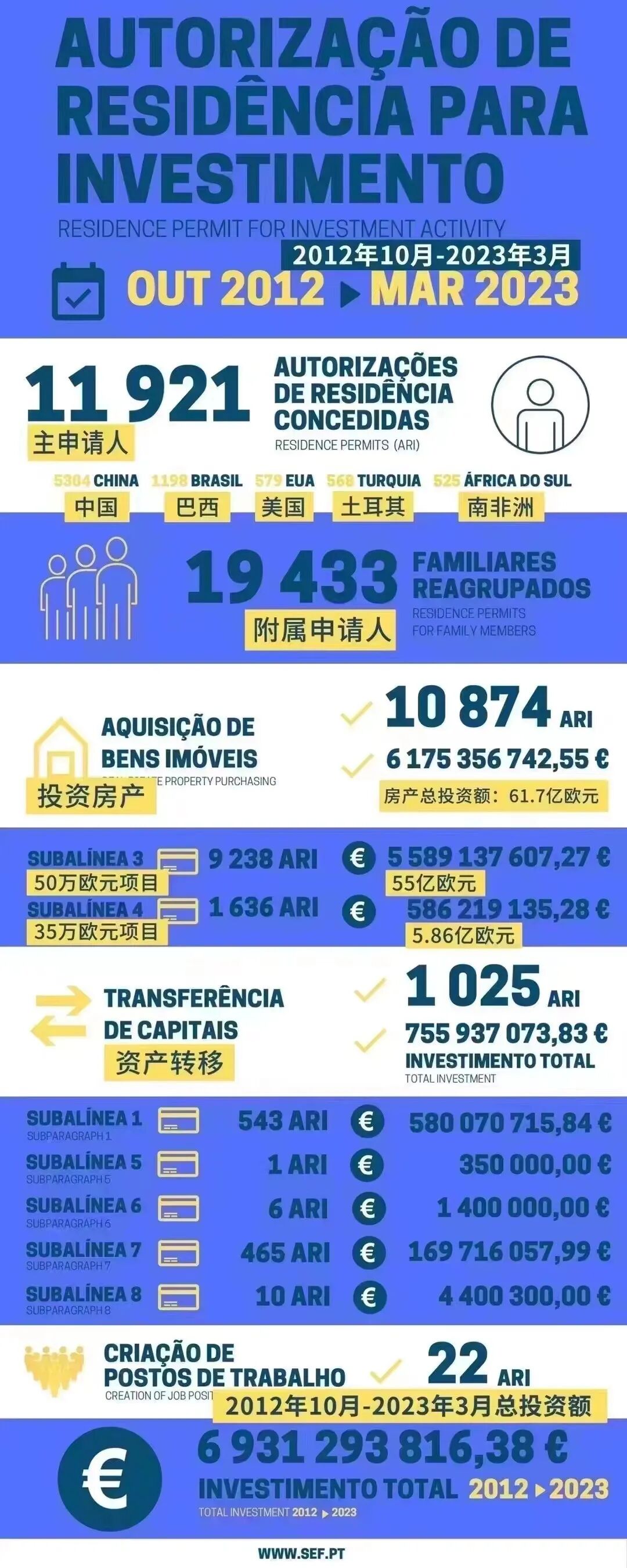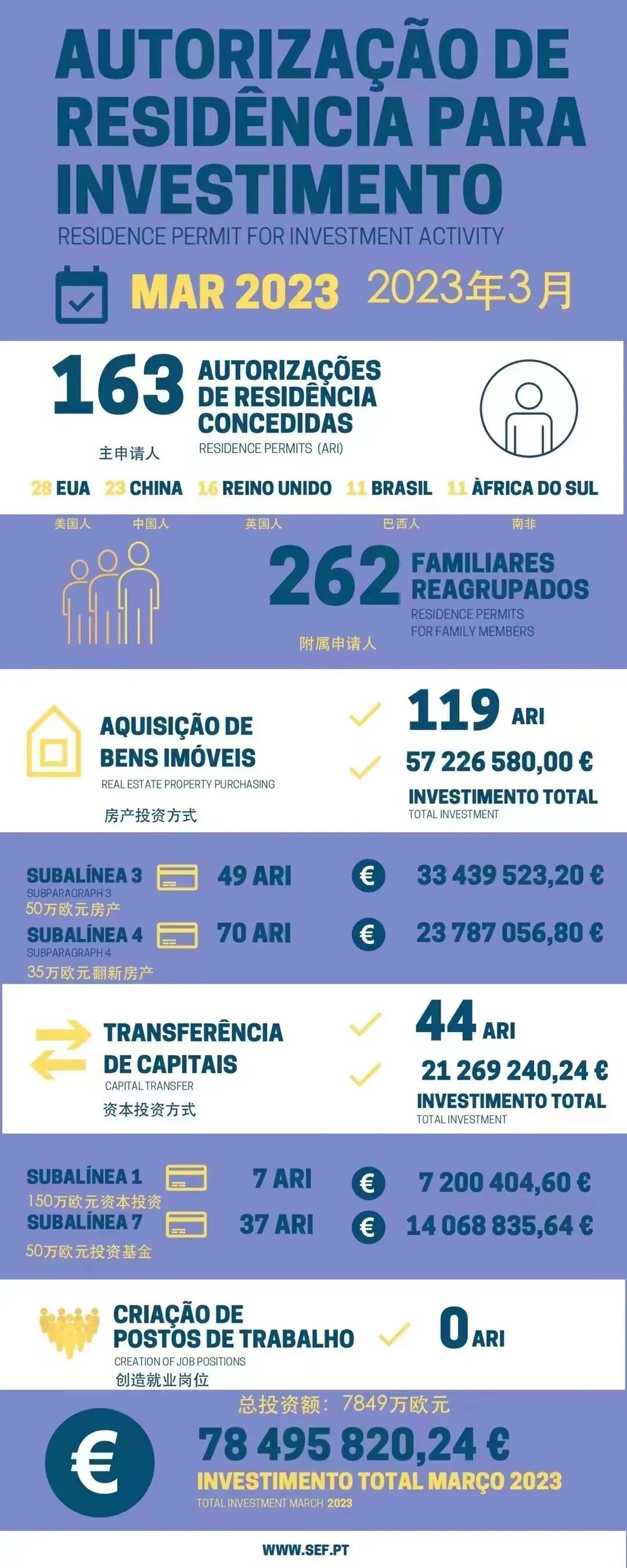 葡萄牙移民局(SEF)公布了新的黄金签证数据:2023年3月共有163位主申请人和262位附属申请人获批葡萄牙黄金签证。