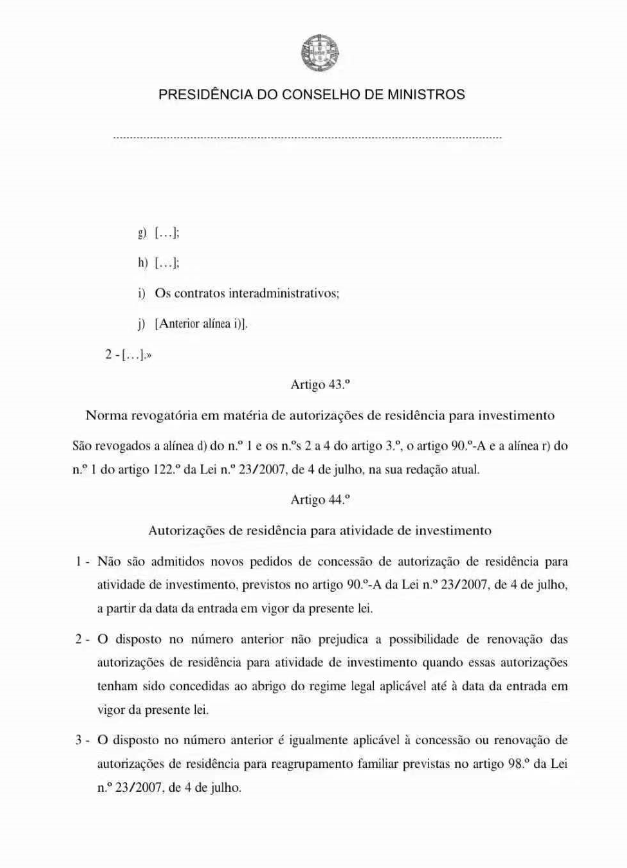 在经历了充满不确定性的两个月后,葡萄牙政府于4月15日发布了《更多住房》法案的最新草案,政府在一些关键点上妥协了,相较于3月30日提交给议会的草案也更加温和了,不过最终结果如何, 还待议会在未来几周进行讨论。最初,葡萄牙政府提出项目终结的截止日期为2月16日。如果获批,届时所有这个日子之后递交的申请案将无效,这会涉及到很多的申请案。实际上,项目在立法公布之前还会对申请案开放。换句话讲,黄金签证潜在申请人还是可以按照旧政提交申请案,直到新法公布。诚然,很多在2月16日之后完成投资的黄金签证申请人也是有条件的签署了买卖协议,其中有投资撤回条款。不影响续签和家庭成员的团聚。遵循法律常识,没有追溯效力,黄金居留保持7天居住要求,已递交未获批的申请都收到法律保护。还没有签发的初次黄金签证以及现有等待续签的黄金签证分别在签发和续签的时候将会转换为D2(企业家)签证。但是,黄金签证转D2签证的持有人不受年度183天居留要求的约束,这一要求只适用于原始的D2签证类别。另外,政府作出了重大退让,现在提议保留签证持有人一年7天的居留要求。还有一个积极的转折,政府现在提议向投资支持“艺术创作和文化遗产恢复或维护”的人给予投资类居留许可。投资必须要得到一个或者多个部门的盖章批准,后者需要核实投资的恰当性。这些部门包括:在最新草案版本的法案规定中,黄金签证项目将在新法生效后终结。考虑到已知的议会日程,这个日子至少还有45天才会到来。预计会在六月份内颁布。