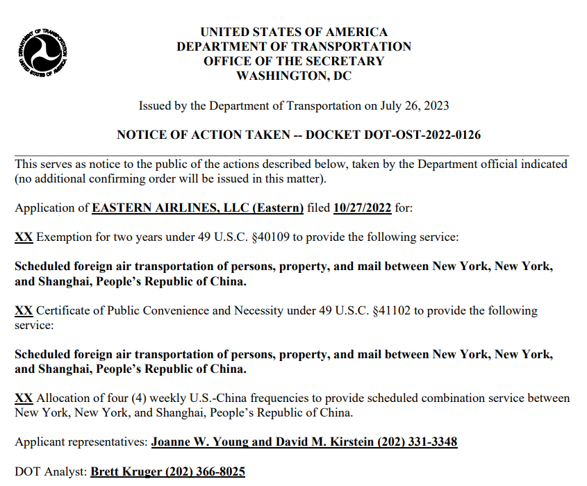根据有关公开文件,美国东方航空(Eastern Airlines)于2022年10月27日向美国交通部提交纽约JFK-上海浦东每周4班客运航班的申请及相关运营豁免。