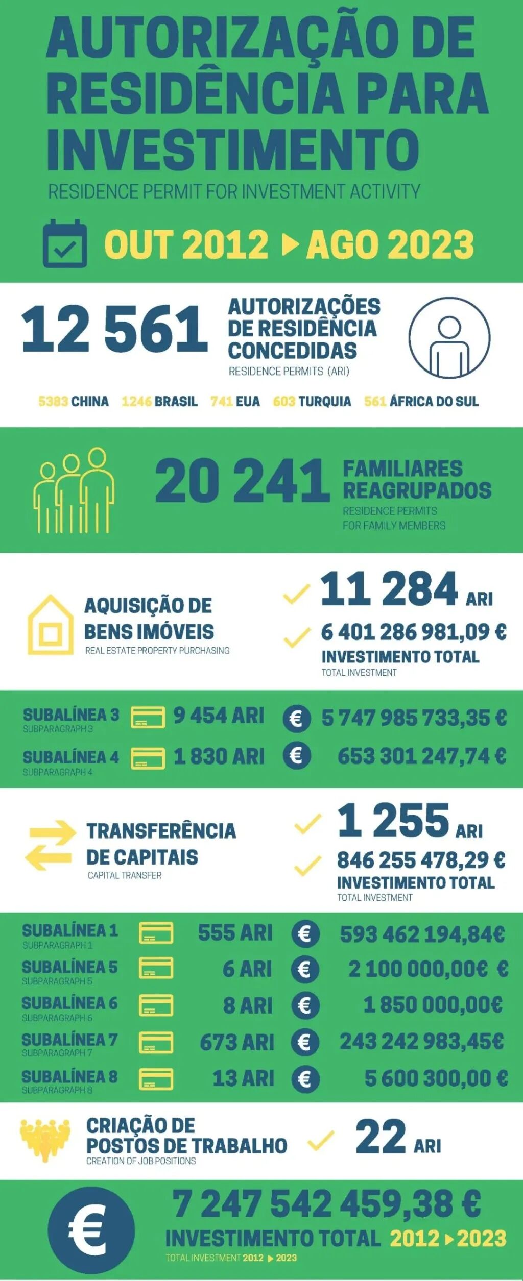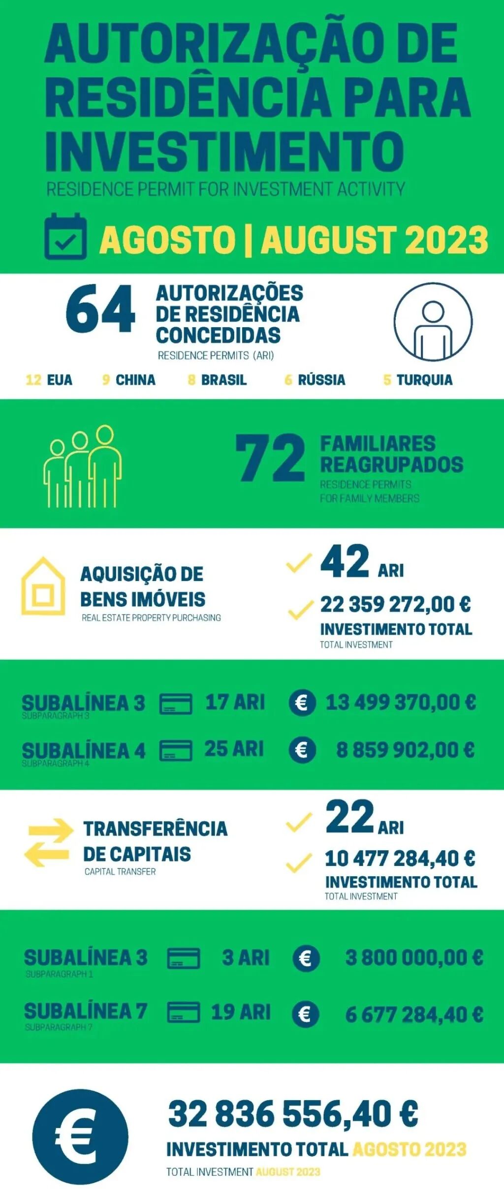 近日,葡萄牙移民局(SEF)公布了2023年8月黄金签证数据。2023年8月共有64位主申请人和72位附属申请人获批葡萄牙黄金签证,总投资额约3,283万欧元。