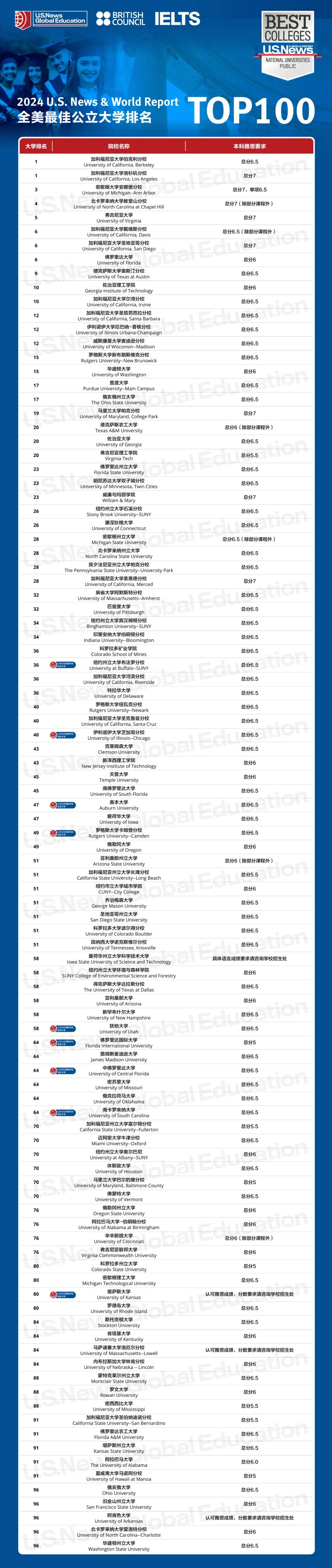 《2024 U.S. News全美最佳公立大学排名》,对公立大学感兴趣的同学可以参考一波~