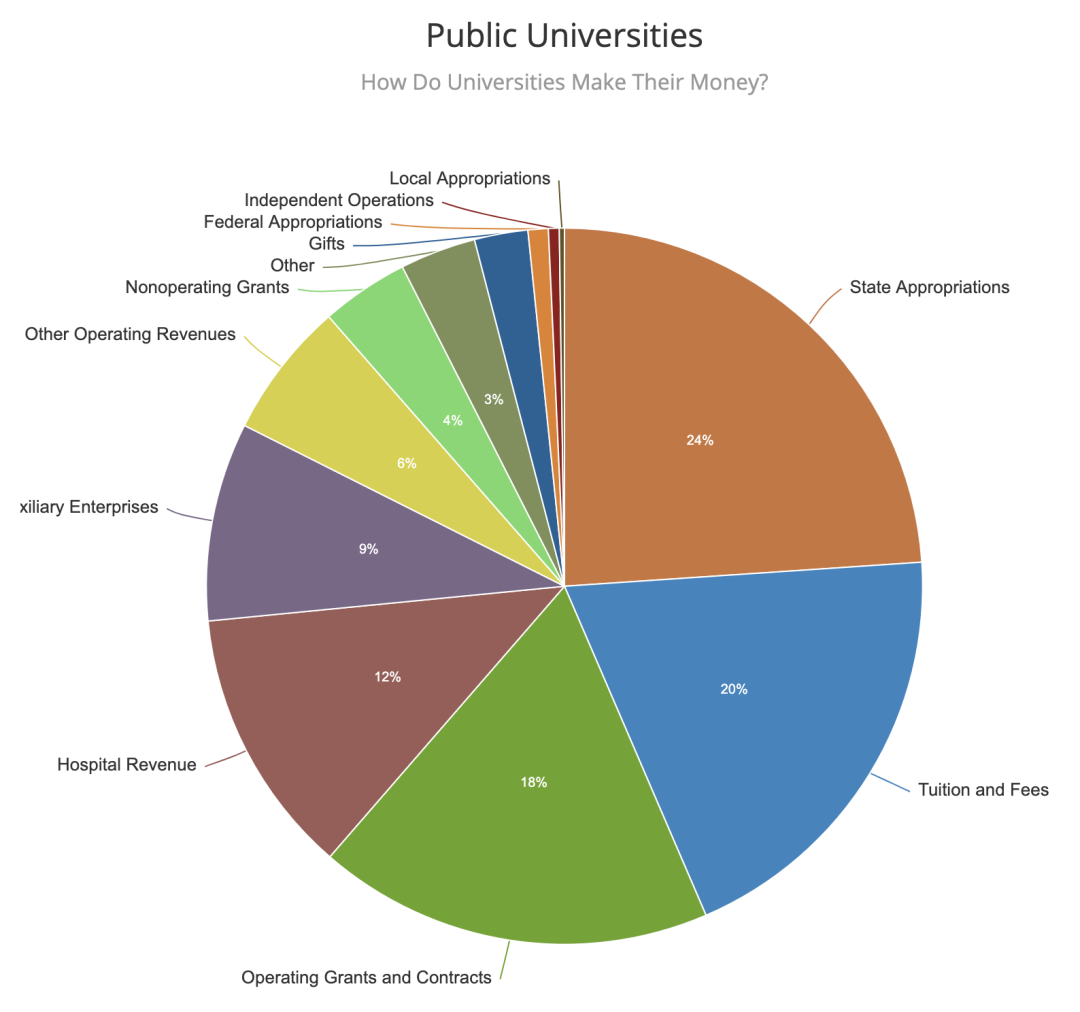 公立大学的优势之一:学费相对便宜,能一定程度上减轻家庭负担,是获取学历“性价比最高”的方式。公立大学的主要经费来源是政府拨款。从下图的对比中可以看出: