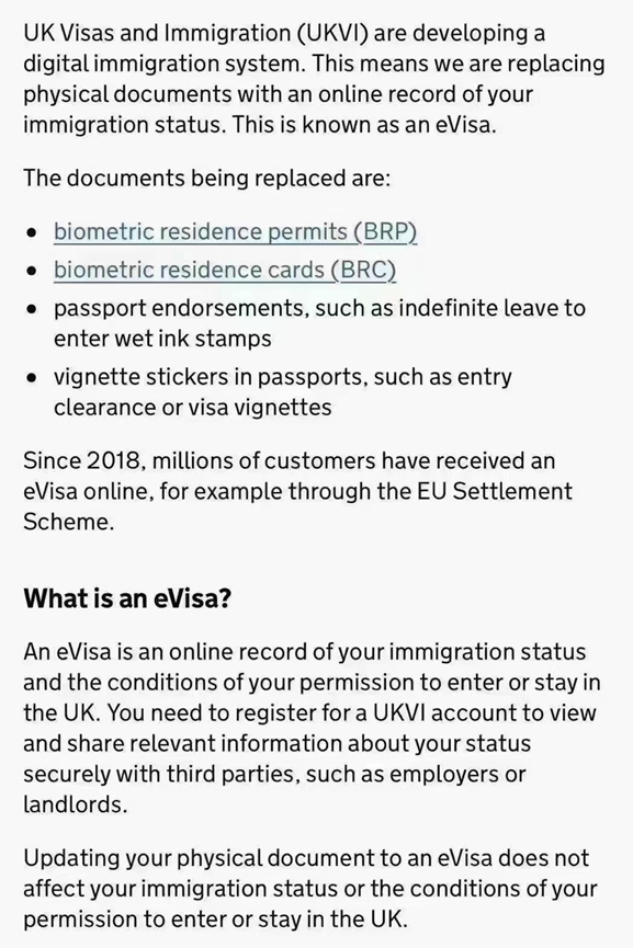 那么,对于那些计划去英国旅游、学习或工作的人来说,这绝对是个好消息!不再需要担心丢失或损坏BRP卡,只需在手机或电脑上申请电子签证,一切都变得简单轻松。根据英国移民局的最新消息,英国将正式启动电子签证系统eVisa,以取代以往的纸质文件!2025年1月1日起,所有在英国持长期签证的人将不再颁发实体BRP卡(生物指纹卡),取而代之的是数字管理方式,随时可以在线查询签证的状态。英国移民局此前就已经公布,就计划在2024年底之前出台全新的签证管理办法,取代现有的BRP形式。现有的BRP和BRC身份卡,护照签注以及护照上的入境许可贴纸等,都将被替代,所有在英国长居或者入境的英国的人,身份信息都将彻底“数字化”。eVisa电子签证是所有居住在英国,以及进入英国的人的许可条件的在线记录,也就是电子身份证,一切信息都将记录在数字档案中。将实体卡/签证页更新为电子签证,将不会影响任何人的移民身份或进入或留在英国的许可条件。首先,与物理文件不同,它们是安全的,不会丢失、被盗或篡改;其次,在申请获得决定后,无需等待或收集纸质文件 - 但可能仍需要亲自提供生物识别信息;最后,在英国边境证明大家的身份时将会更快、更容易!