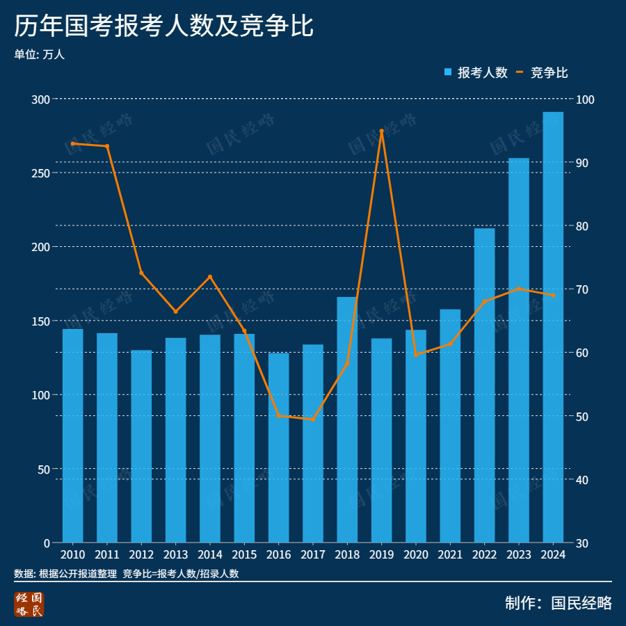 2024年国考报名人数初步统计高达291万人,刷新历史记录,与2019年的138万相比,总体人数翻倍。