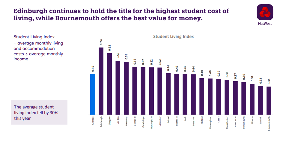 根据Natwest的定义,学生生活指数=平均每月生活费和住宿费的和÷平均月收入。所以生活指数越高,意味着在这个城市生活的成本越高。