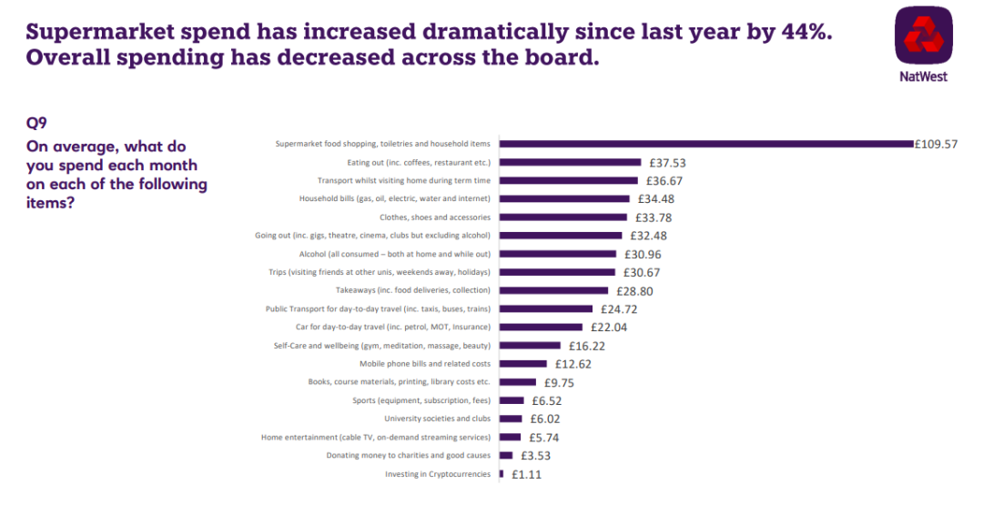 除此之外,学生每月花费占比最大的是“超市支出”,为109.57英镑,比去年上涨了44%。占比第二大的就是“外出就餐”,英国大学生的每月平均花费为37.53英镑。