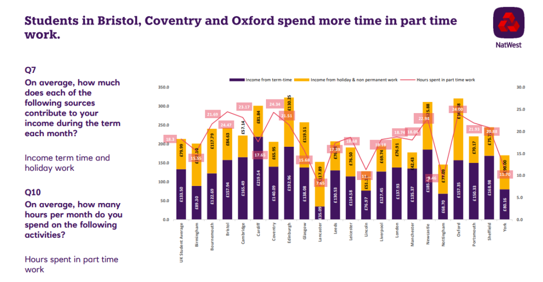 此报告还有其他一些有趣的数据:布里斯托的学生花了最多时间进行兼职工作,每月超过24小时。