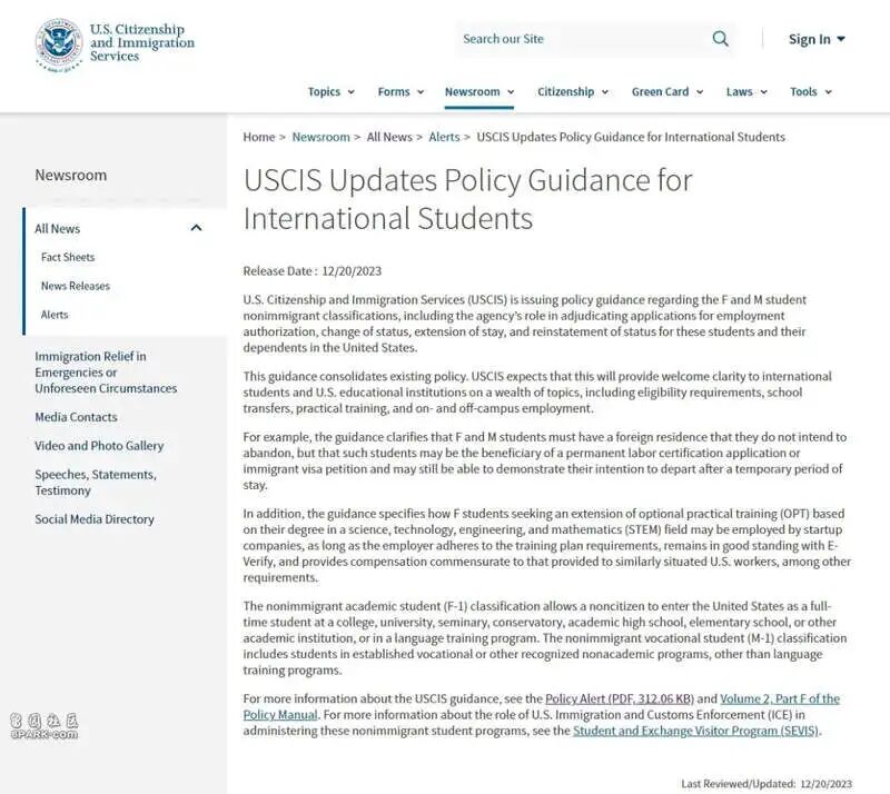美国公民及移民服务局(USCIS)于12月20日在官网更新了留学类签证(F类和M类)的政策指南:明确了留学生及其家属在美国境内的就业许可、身份变更、居留延期和恢复申请方面的诸多疑问。