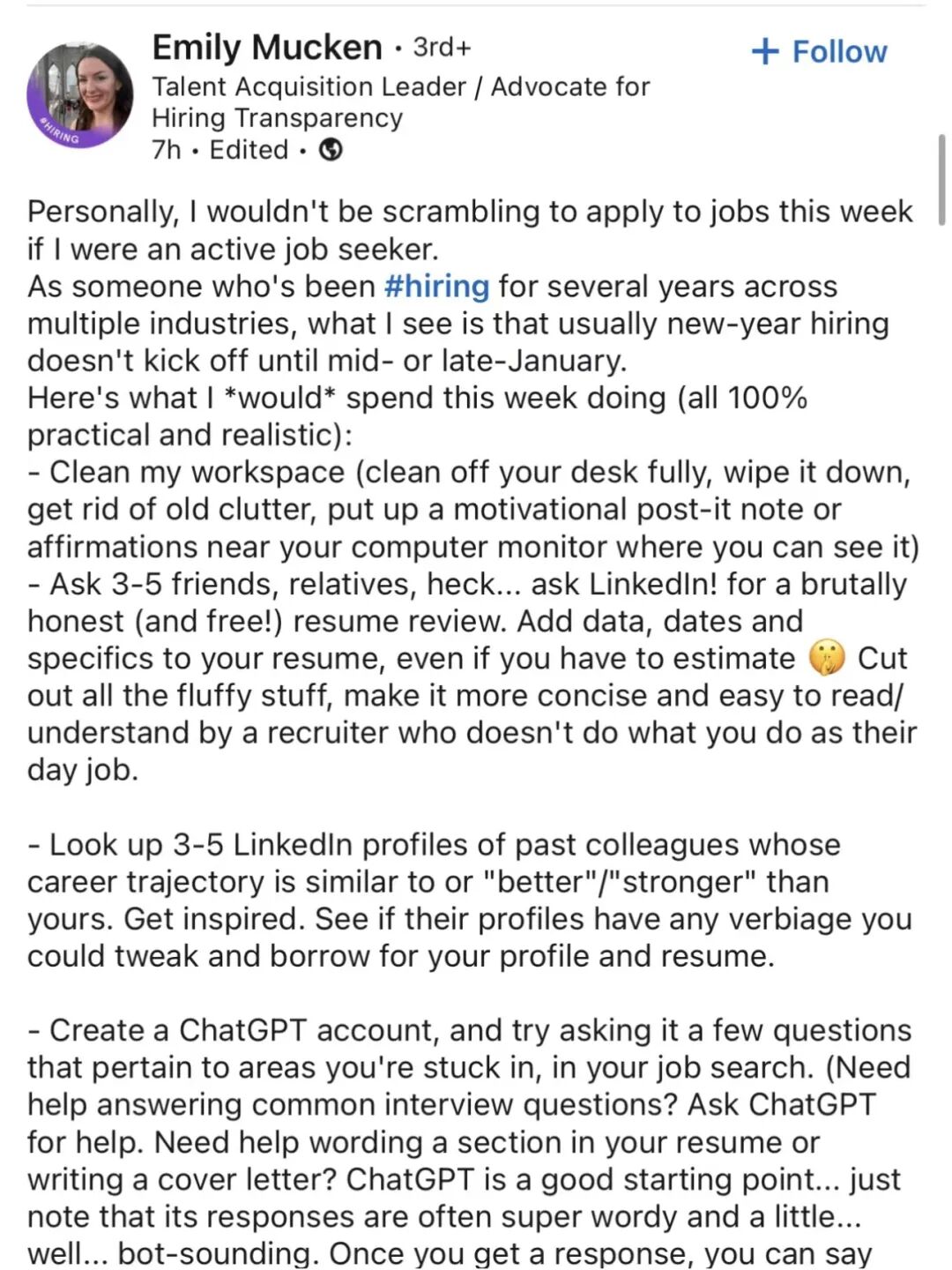 最近领英上有一则有趣的帖子,表示“新年过后的求职高峰期应该是1月中旬以后",那么在这之前我们应该做些什么呢?