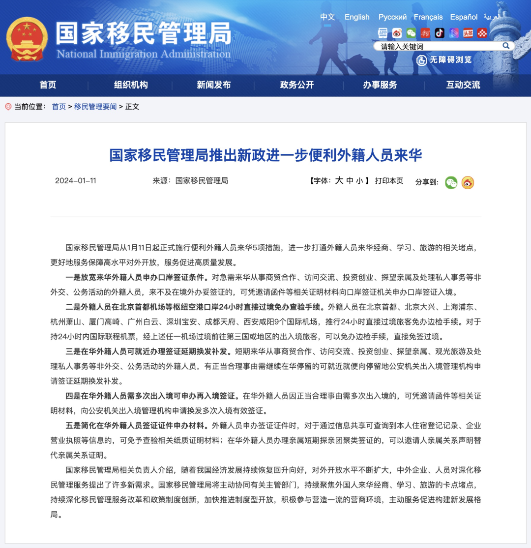 中国国家移民管理局推出新政,1月11日起,正式施行便利外籍人员来华的5项措施。