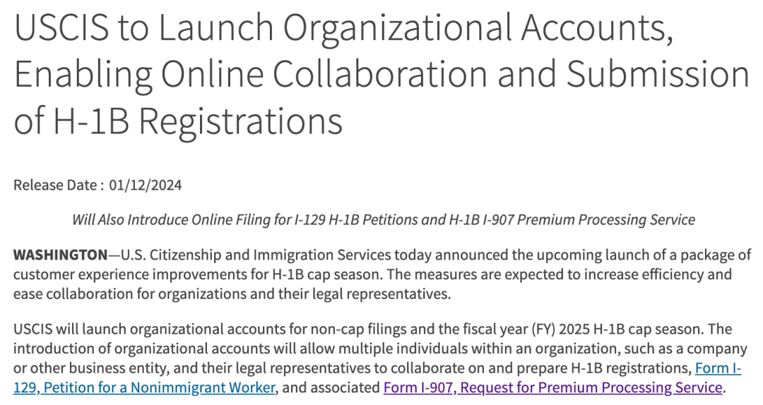 这个账户将允许组织内多人(像雇主、律师等)同时参与H-1B的网上注册、填写I-129表格、申请H-1B、以及申请PP加急填写I-907表格。