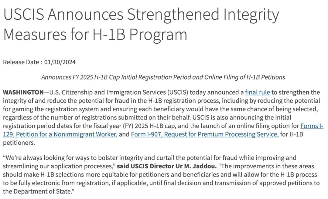 1月30日,美国国土安全部把H-1B改革方案的Final Rule放到了联邦公告——