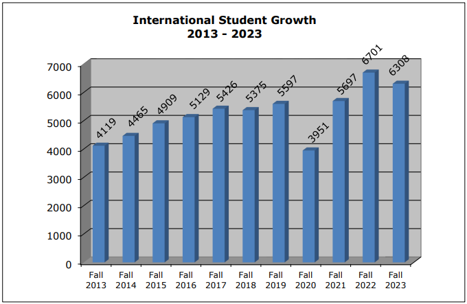 近十年来,CMU国际生人数总体呈上涨状态。虽然2023年国际生人数有所下降,但是依然处于历史第二高位。