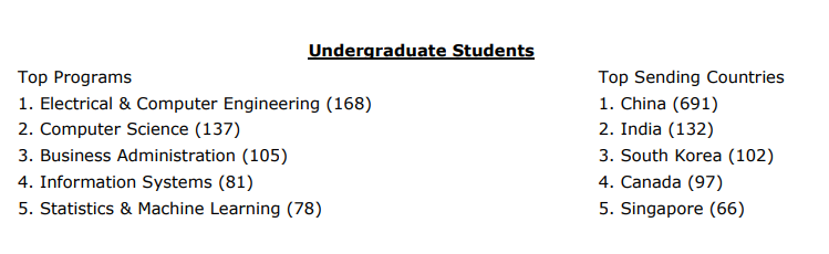 其中,国际本科生选择最多的专业是电子和计算机工程(168人)、计算机科学(137人)、商业管理(105人)、信息系统(81人)、统计与机器学习(78人)。