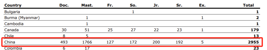 报告中还列出了不同学位在读中国学生的细分人数:在2,955名在读中国学生中,博士研究生493名、硕士研究生1,766名、大一本科生127人、大二172人、大三200人、以及大四学生192人。