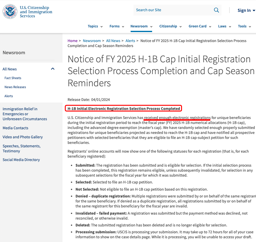 目前美国移民局USCIS在官网发布声明:“首抽已收到足够的电子注册信息,以达到 2025 财年 (2024年) H1B 数量上限。”