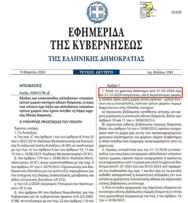 此前,希腊公民保护部曾发布公告指出,希腊允许自2024年1月1日至2024年3月30日期间的第三国公民持有希腊合法居留许可或是持有“等待纸”多次免签入境希腊,为期三个月。3月21日,希腊公民保护部发布公告称,在2024年3月31日至2024年12月31日期间,希腊将继续允许持有希腊合法居留许可或是持有“等待纸”的第三国公民多次免签入境希腊,目前新规已于3月31日起生效!根据最新的公告指出,凡持有有效护照或是其他旅行证件,已首次提交居留申请或是更新居留许可所需的所有证明文件,或持有合法居留特殊证明的所有第三国公民,在2024年3月31日至2024年12月31日期间都可以多次离开和返回希腊。此外,若上述类别的第三国公民在2024年1月1日至2024年3月30日期间离开希腊的,并且持有上述合法证件的,都将可以在2024年12月31日之前重新入境希腊,但前提是他们首次提交居留申请、更新居留许可、持有效合法居留特殊证明等相关申请的决定未被拒绝或是撤销。2024年4月2日起新增上海至希腊雅典直飞航线,波音787-9宽体客机直飞。每周三班,逢周二、周四、周六运行。