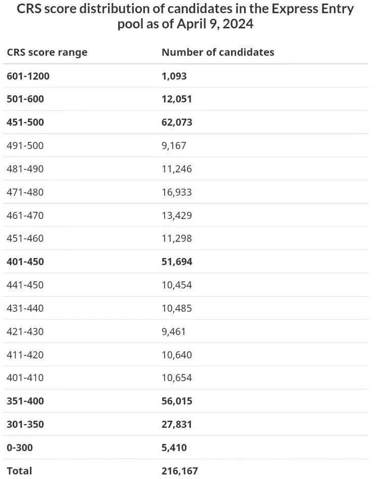 目前,IRCC正在努力处理池中的快速通道候选人。池中候选人分数和人数分布情况如下: