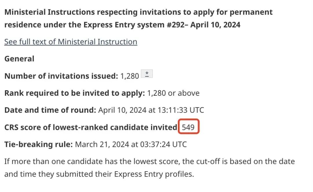 4月10日,加拿大移民部(IRCC)进行了最新一轮的EE快速通道抽签,邀请分数549分,创下了五年内历史第三高!