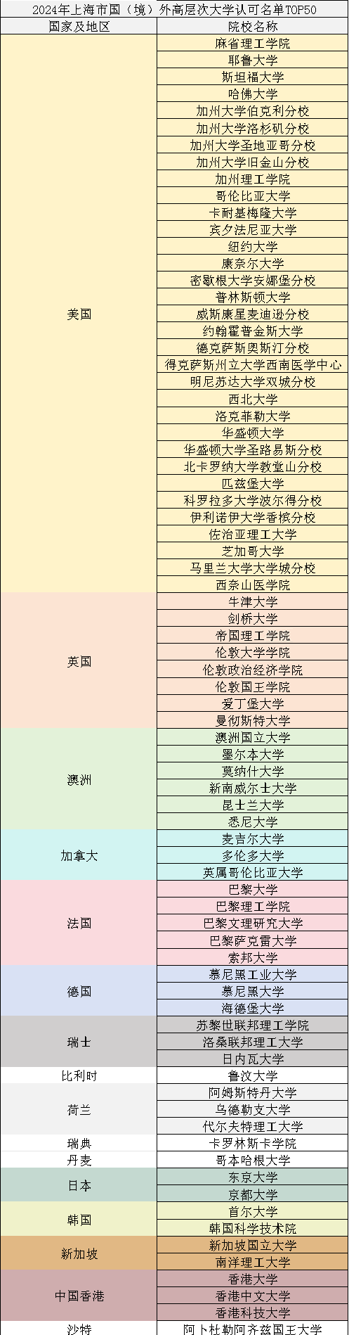 本名单为留学生落户申办系统内前50大学名单,为便于大家快速查看,我们按留学国家整理排版,排名无先后。具体如下: