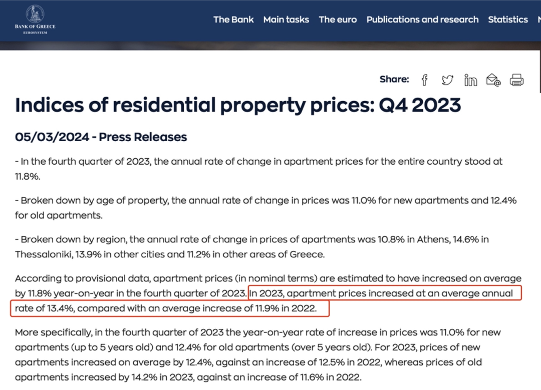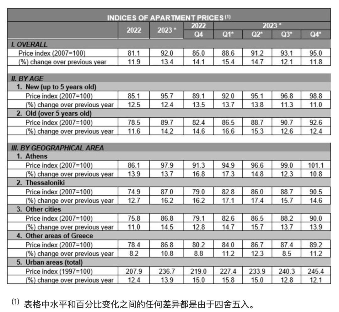 根据希腊银行2024年3月5日公布的数据显示,与2022年11.9%的涨幅相比,2023年希腊的公寓价格上涨了13.4%。具体而言,按房产年龄细分2023年第四季度与2022年同期相比,5年以下公寓的价格上涨了11%,5年以上公寓的价格上涨了12.4%。按地区细分,2023年第四季度,雅典的公寓价格同比增长10.8%,塞萨洛尼基增长14.6%,其他大城市增长13.9%,其他地区增长11.2%。与2022年相比,同一季度的房价分别上升了13.7%、16.2%、14.5%和10.8%。来源:希腊银行;链接:https://www.bankofgreece.gr/en/news-and-media/press-office/news-list/news?announcement=b36800c6-d803-4199-9c18-46e88b513826持续上涨的房价,给本地人带去了巨大的购房压力。而住房问题根本上是一个民生问题,房价高也会让欧洲各国政府内部感到压力,需要限制甚至关停购房移民,给本国购房者一个交代。
