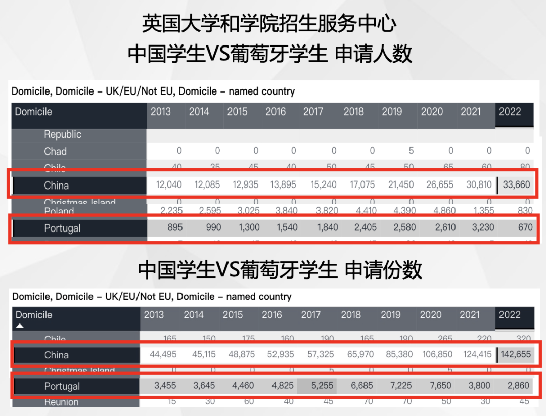 同时对于海外名校申请情况,以英国为例,录取比例也远高于大陆身份申请者,且整体竞争小很多。根据英国大学和学院招生服务中心(UCAS) 数据,截止2022年底,中国大陆学生申请量持续暴涨并再创新高,达到142,655份申请,比2021年增加18,240份,涨幅约达15%。其中,总申请人数33,660人次,中国大陆学生间的竞争逐年增加。而葡萄牙申请人数仅为670人次,是大陆申请竞争对1/50。