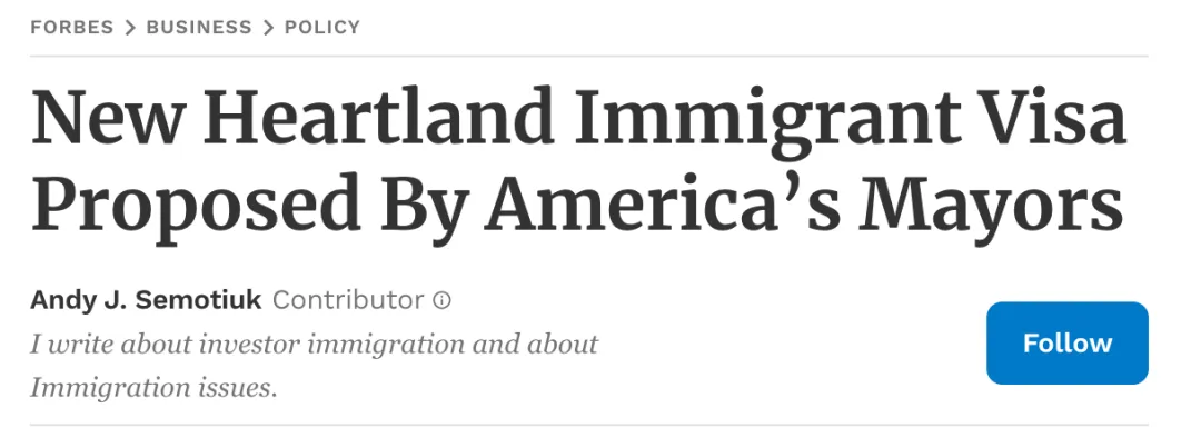 2024年7月2日,美国媒体《福布斯》报道称,由美国市长联合会(USCM)通过的一项由两党都支持的一份决议,推出了一项“心脏地带移民签证”(Heartland Immigrant Visa),每年10万个名额,可快速获得美国绿卡!