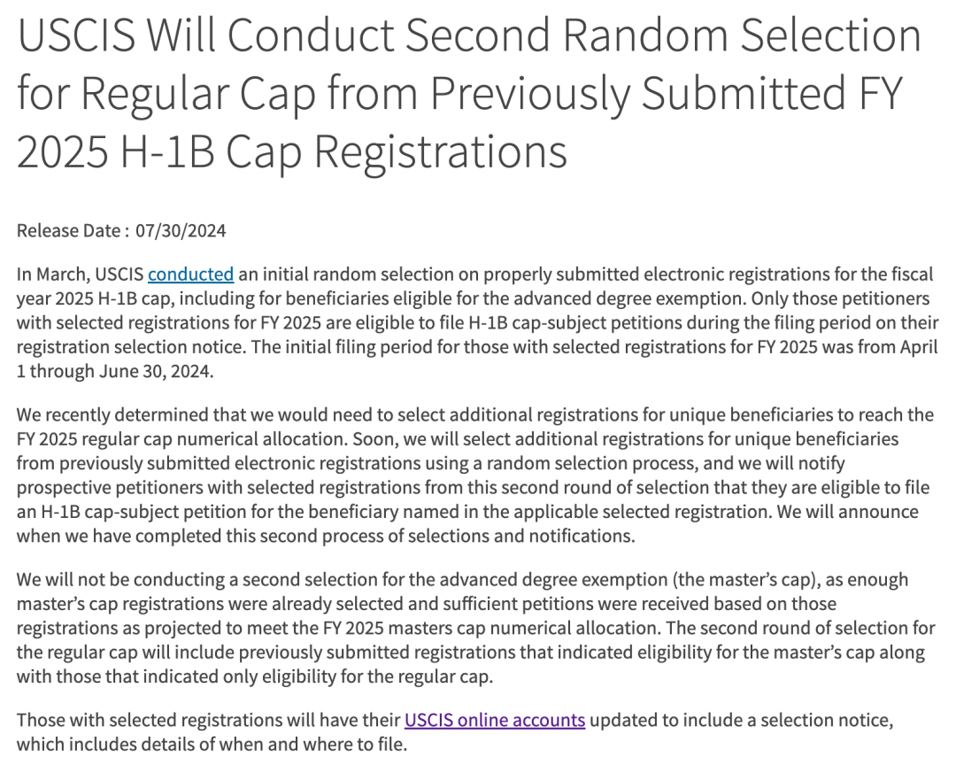 就在美东时间7月30日上午10:30,美国移民局USCIS宣布将进行2025财年H1B第二轮抽签!