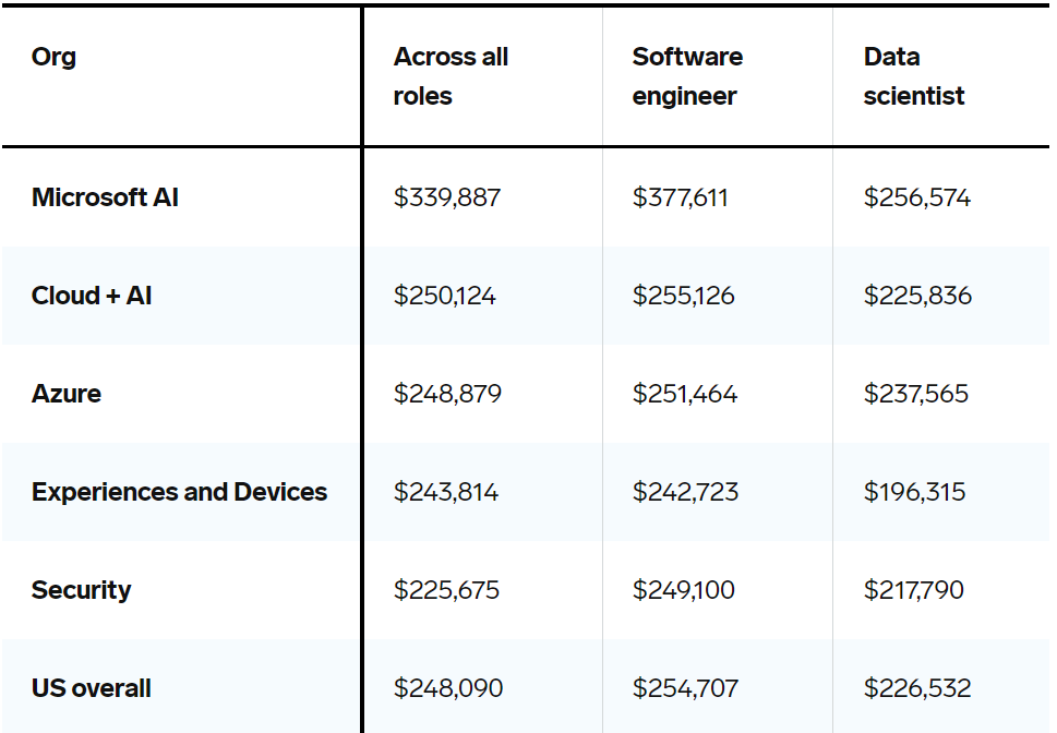 据 Business Insider 报道,新成立的微软 AI 部门职位平均薪酬为339,887美元,比其他部门平均薪酬高出一大截,